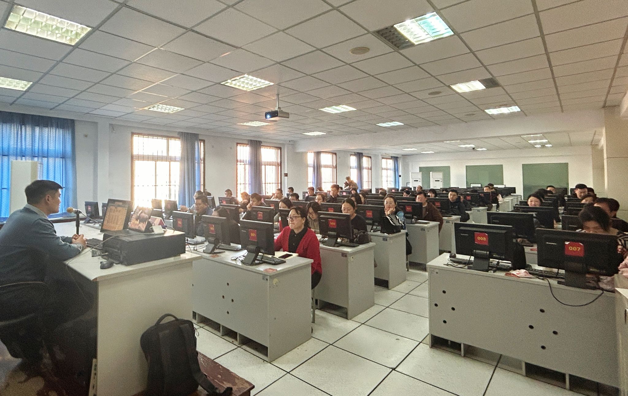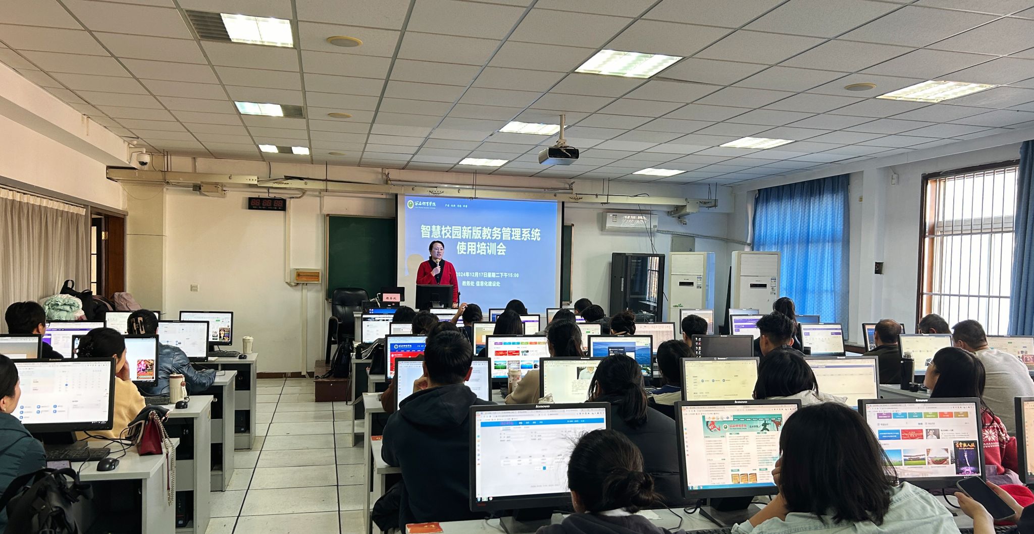 为进一步提升我校教务教学管理的信息化水平,实现新老教务系统的顺利衔接,促进教务教学管理优化升级,我校于12月17日下午在含光校区新教学楼604计算机房,举办了智慧校园新版教务管理系统使用培训会。各二级学院教学副院长、教学办公室主任、教研室主任等60余人参加了培训会议。培训会由教务处教务科副科长陈英主持。
