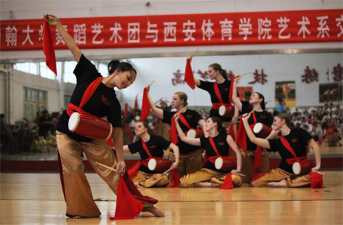 汇报表演在欢快激昂的傣族鼓乐舞蹈表演中拉开帷幕。紧接着,歌舞《Jambalaya》、《排舞》等表演给大家带来视觉和听觉的双重享受;《健身健美展示》、《女儿花》、《竞技健美操》、《街舞》、《舞蹈啦啦操》及美国学生自编的一系列舞蹈表演带给在场观众持续不断的美感与激情。美国学生通过短期学习创编的《安塞腰鼓》表演把整个会场气氛推向高潮。动感的舞曲,潇洒的舞步,火红的舞裙,飞扬的头巾,将两种不同文化的蓬勃朝气与无限魅力尽情展现。