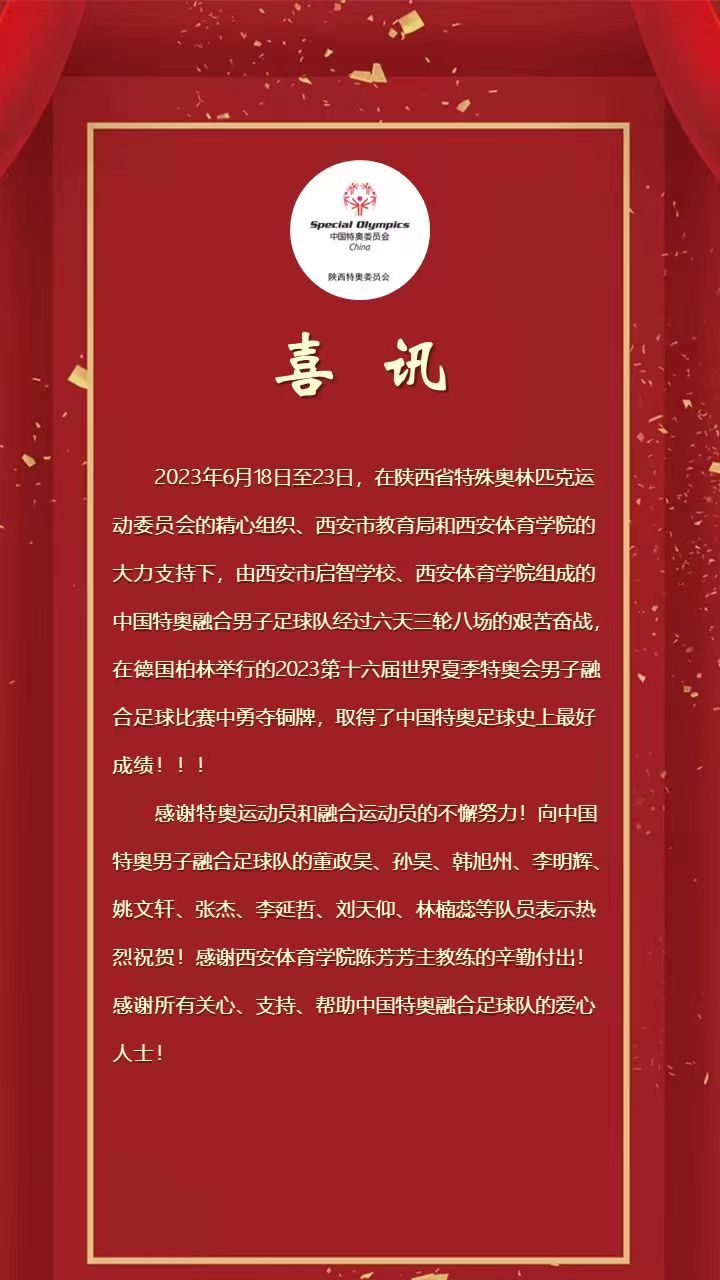比赛结束后,陕西省残联、陕西省特奥委员会第一时间向球队全体将士表达了祝贺和感谢,“感谢特奥运动员和融合运动员的不懈努力!向中国特奥男子融合足球队的董政昊、孙昊、韩旭州、李明辉、姚文轩、张杰、李延哲、刘天仰、林楠蕊等队员表示热烈祝贺!感谢久久不卡区陈芳芳主教练的辛勤付出!”