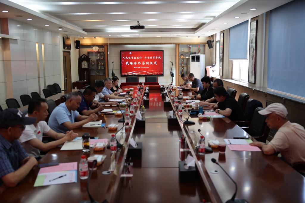本网讯 7月10日上午,我校与人民体育出版社战略合作签约仪式暨统编教材编写座谈会在行政楼二楼大会议室举行。人民体育出版社社长李百放、教材部主任李凡、发行部经理张捷,我校副校长陈彦、“十四五”体育院校通用教材主编白石教授、“十四五”体育院校通用教材主编雷福民教授出席。教务处副处长姜健主持签约仪式。