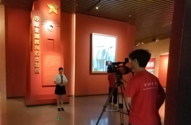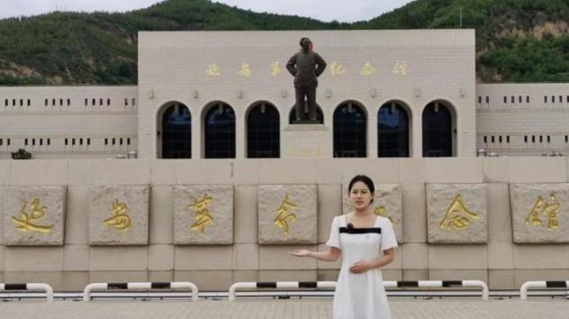 图为实践团队成员在杨家岭革命旧址录制视频,讲述红色故事
