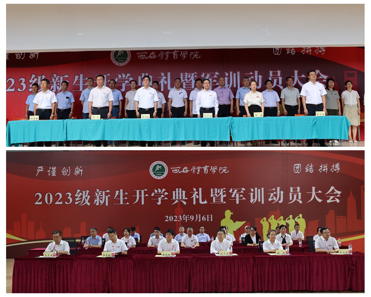 校长刘子实代表学校对2023级同学们加入西体大家庭表示热烈欢迎,向辛勤培育同学们的父母师长表示衷心感谢,向承担本次军训任务的全体教官致以崇高敬意。他以《勤学实干明德 书写无悔青春》为题,为新生送上真挚的致辞。他从“大学是什么?”“西体是一所什么样的大学?”“西体能给大家带来什么?”“如何度过在西体的大学时光?”四个话题发问,并分享了自己的思考。从典籍里的“大学”为题,向同学们介绍了西体的历史传承和深厚底蕴。他表示,在西体不仅可以收获扎实的知识与技能,还能注入积极向上的力量,更能磨炼强健的体魄和坚强的意志。第一,为学之道贵在勤奋。要转变思维,变“被动学习”为“主动探索”。珍惜大学生活,规划好学习目标和计划,追求真理、探索新知,成为能够担当民族复兴大任的栋梁之才。第二,为事之道贵在实干。要知行合一,知识学习和能力锻炼并重。要利用好学校的优质资源,“厚基础、宽口径、严要求、重实践”,争做一专多能的应用型、创新型、复合型人才。第三,为人之道贵在德行。希望同学们明大德,涵养家国情怀,把小我融入党和祖国的大我,与时代同步伐、与人民共命运,不断升华人生境界;坚守中华民族传统美德,遵守法律法规,弘扬公平公正、自信自强的体育精神。最后他希望同学们在军训期间不怕苦、不怕累,严格遵守纪律,一切行动听指挥,秉承“严谨 创新 团结 拼搏”的校训精神,用勤学铸就本领力量、用实干历练成长成才、用明德把准人生航向,在西体这片沃土绽放青春奋斗的绚丽之花!