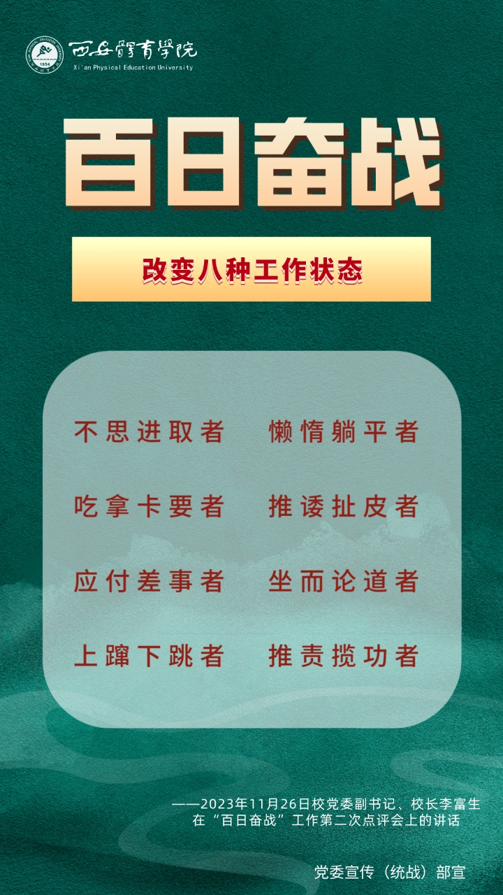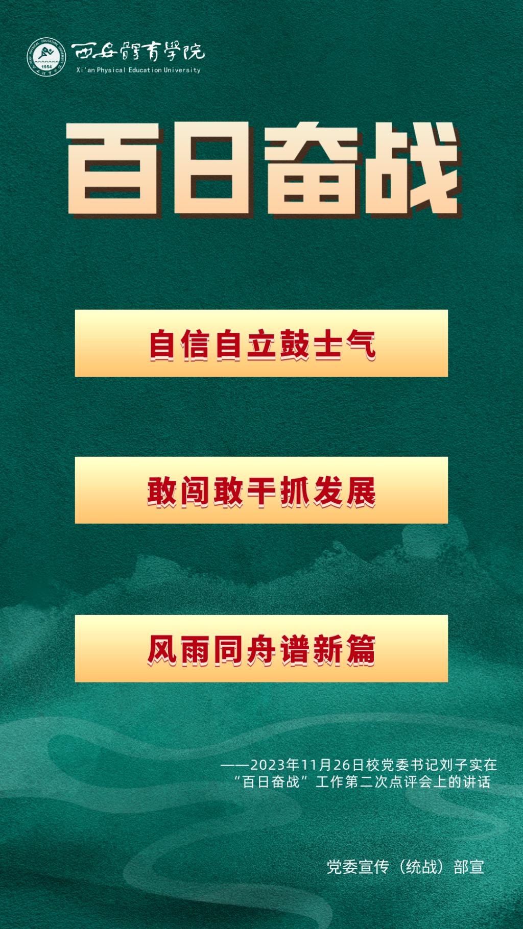 为持续掀起“百日奋战”的热潮,保持学校各项事业高质量发展的战略定力,动员全校师生员工为学校改革发展勠力同心、接续奋斗,本公众号将以专栏形式推出“百个要点”的“百张海报”,将“百日奋战”相关会议的主要会议精神和重点内容进行摘录报道,以供师生员工学习交流。