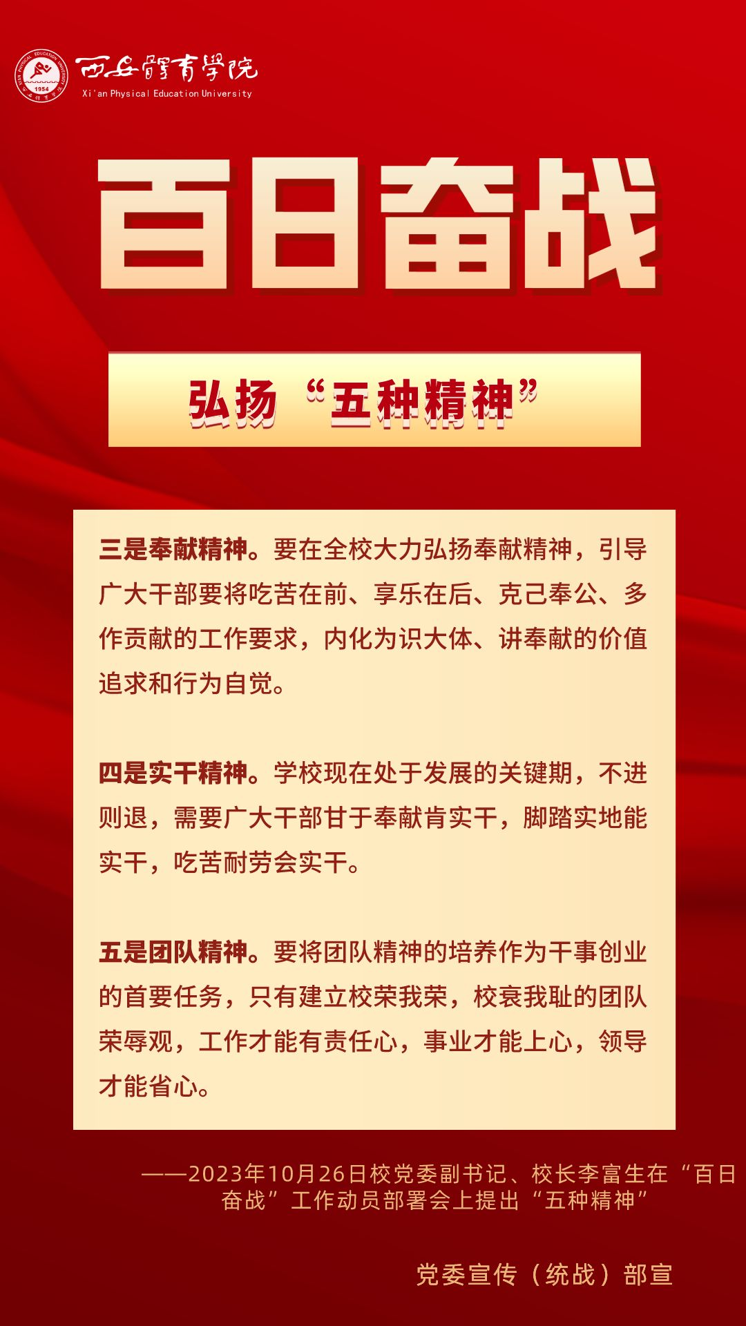 为持续掀起“百日奋战”的热潮,保持学校各项事业高质量发展的战略定力,动员全校师生员工为学校改革发展勠力同心、接续奋斗,本公众号将以专栏形式推出“百个要点”的“百张海报”,将“百日奋战”相关会议的主要会议精神和重点内容进行摘录报道,以供师生员工学习交流。
