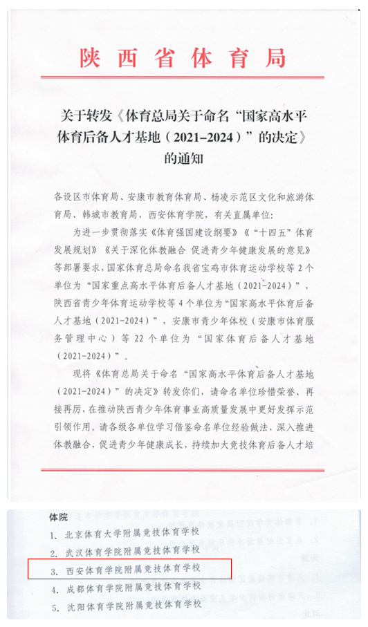 本网讯 近日,国家体育总局发布了《体育总局关于“国家重点高水平体育后备人才基地(2021-2024年)”的决定》,我校附属竞技体校成功入选“国家重点高水平体育后备人才基地(2021-2024年)”。