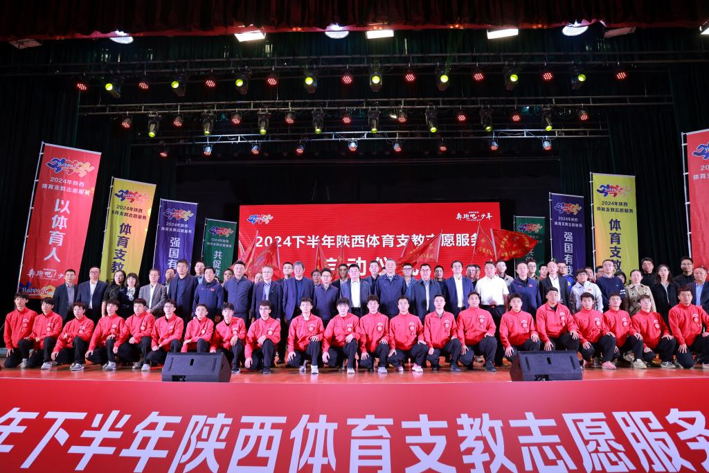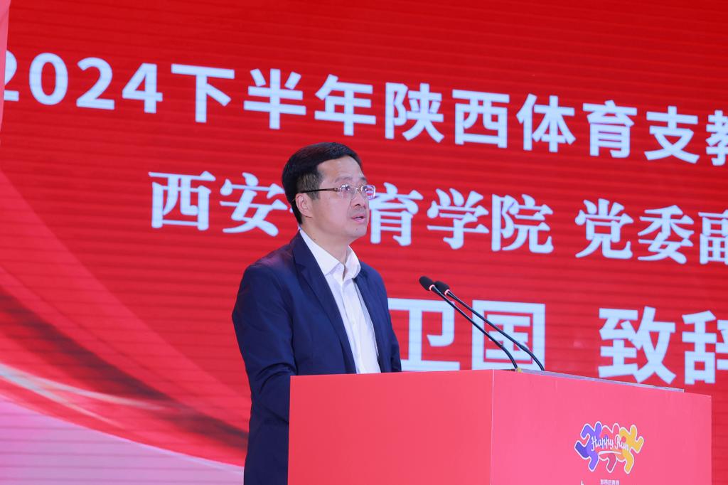 本网讯 10月13日上午,2024年下半年陕西省体育支教志愿服务启动仪式在我校艺术馆大礼堂举行。省体育局党组成员、副局长邹军,省教工委委员、省教育厅副厅长吴振磊,共青团省委副书记惠旋,我校校长李富生、党委副书记张卫国出席并共同启动2024年下半年陕西省体育支教志愿服务活动。由我校牵头来自全省8所高校的优秀体育支教志愿服务队员以及省体育局、教育厅、团省委机关负责同志,陕西体育支教派出8所高校领导,10个支教地市体育局领导、10个支教县区教育体育局领导共同参加启动仪式。