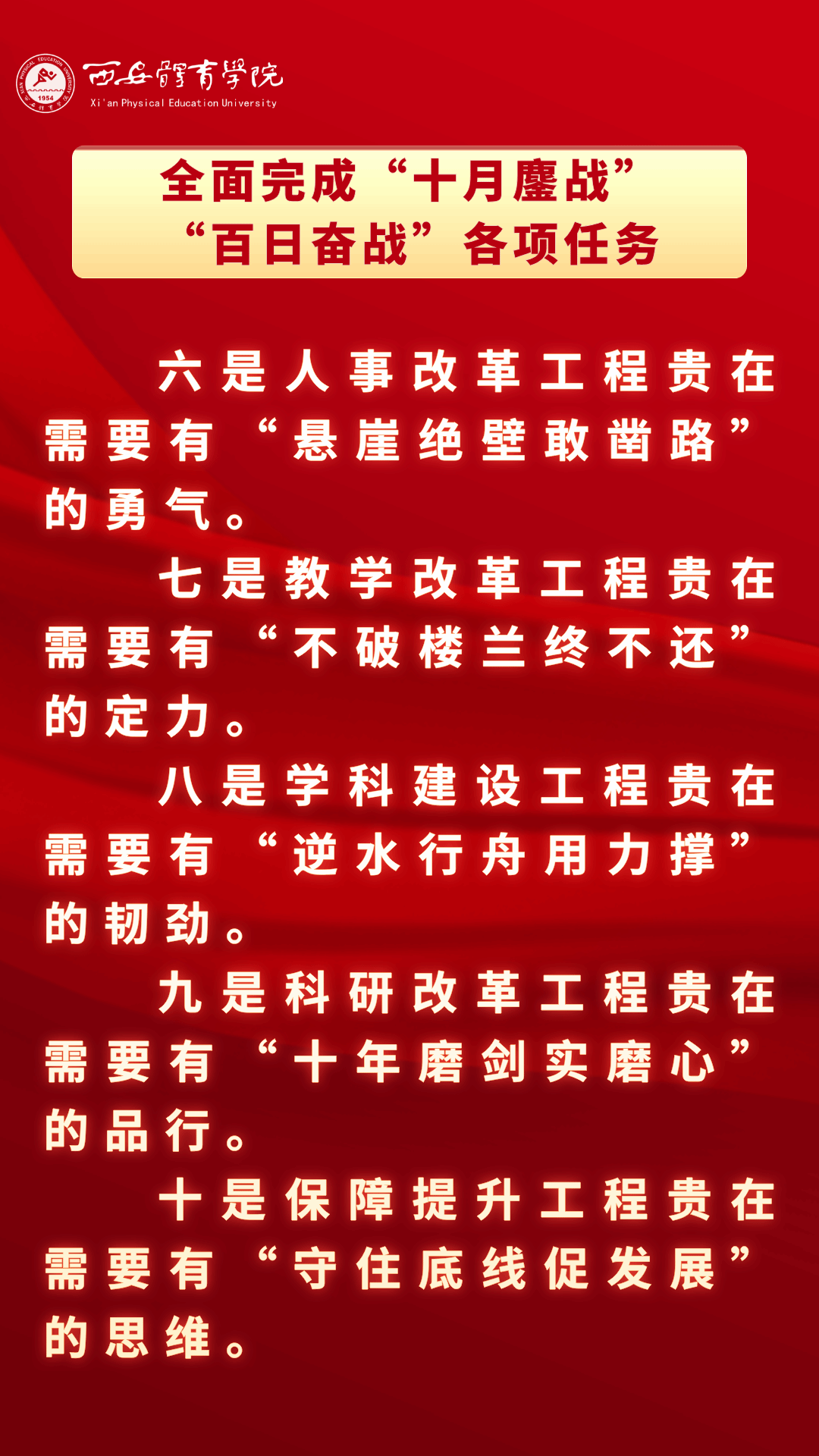 【编者按】:2023年9月我校新班子到任以来,紧扣高质量发展主线,以强化党建为引领,以深化改革为动能,主动应对风险挑战,抢抓发展机遇,开展“百日奋战”、“十月鏖战”,实施“十大改革发展工程”,全校上下凝心聚力,加压奋进,各项工作焕发出新气象。2024年11月26日,学校召开了“十大改革发展工程”第24次推进会,会议的召开为凝聚全校共识、加强同频共振,紧抓快干、埋头苦干、真抓实干注入新动力。为此我们特推出会议精神海报,传递党政工作思路,推进工作落实,团结鼓劲冲刺。