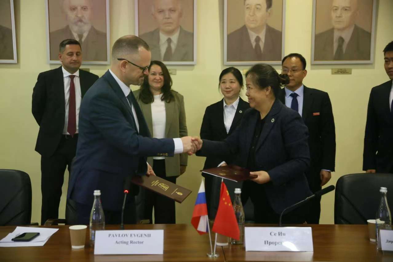 访问期间,谢英与俄罗斯体育大学代理校长巴甫洛夫·耶夫盖尼·亚里克桑德罗维奇举行了会谈。双方就各自学校的办学历史、现状及未来发展规划进行了深入交流,并在互派专家参加学术会议、继续教育、师生实习实践、科研与教学信息共享等多方面达成共识,共同签署了合作意向协议,为两校进一步合作奠定了坚实基础。双方还围绕语言学习、中短期师生互访、“3+1”“2+2”合作办学模式等议题展开了详细讨论。我校研究生部主任杨建设与运动休闲学院党总支书记郭春玲分别介绍了我校研究生部与运动休闲学院的专业设置与建设成果,展示了我校在体育人才培养方面的特色与优势,增进了俄方对我校教育资源的了解,为后续合作项目的开展提供了有力支撑。