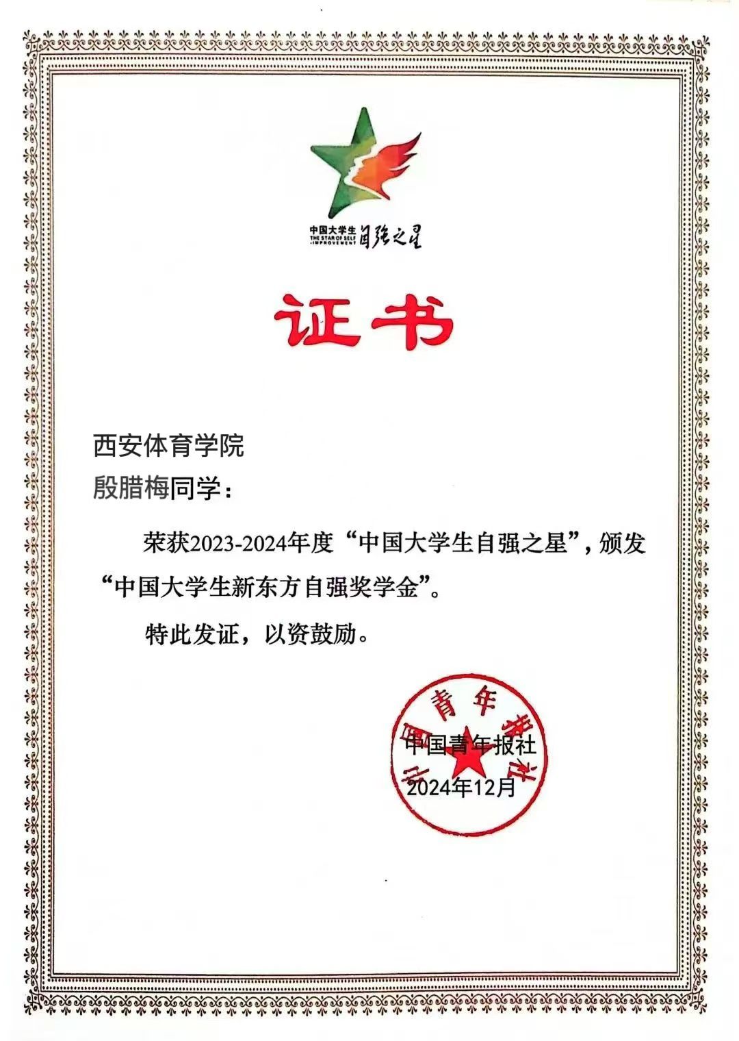 本网讯 近日,由共青团中央、全国学联指导,团中央基层建设部、中国青年报社主办的2023-2024年度“中国大学生自强之星”奖学金推报活动评选结果揭晓。我校运动训练学院2020级学生、竞走国际健将殷腊梅荣获“中国大学生自强之星”荣誉称号。