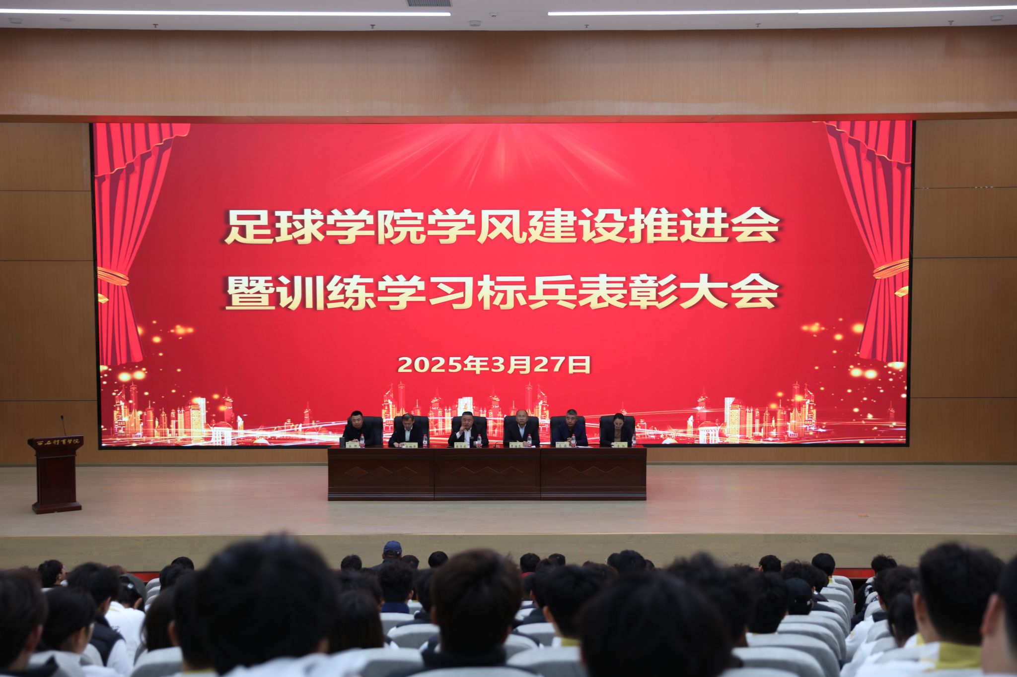 本网讯    为加强学风建设,3月27日,足球学院召开学风建设推进会暨训练学习标兵表彰大会。学院党政领导、校男女队主教练、全体辅导员出席大会,2022级、2023级、2024级全体本科生参加大会。